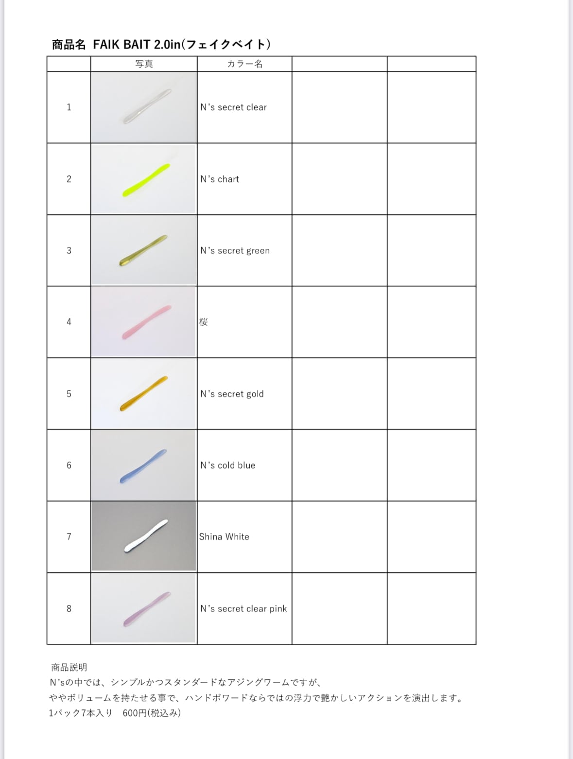 N'sの中では、シンプルかつスタンダードなアジングワームですが、ややボリュームを待たせる事で、ハンドポワードワームならではの浮力め艶かしいアクションを演出します。