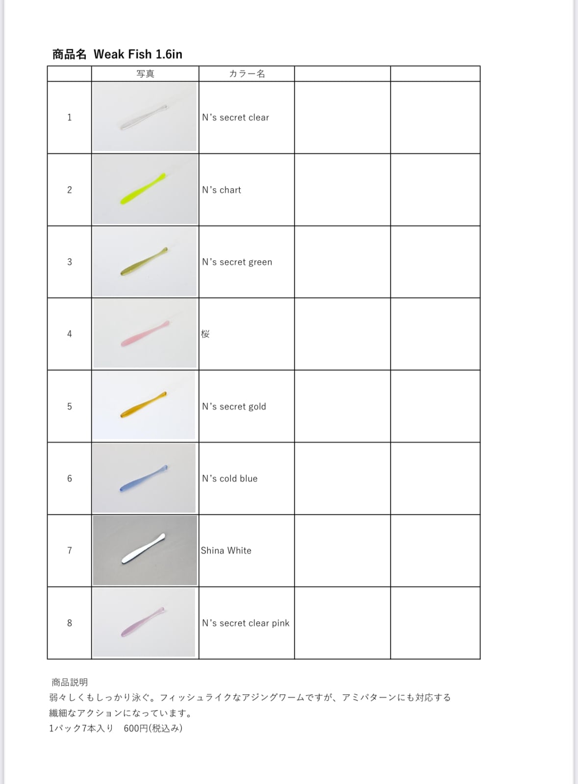 Weak Fish 1.6 inは、その微細な動きと繊細なサイズ感でターゲットの魚を引き寄せる特別なワームです。特にライトゲームに最適で、泳がせ方によってはさまざまなアクションを楽しむことができます!