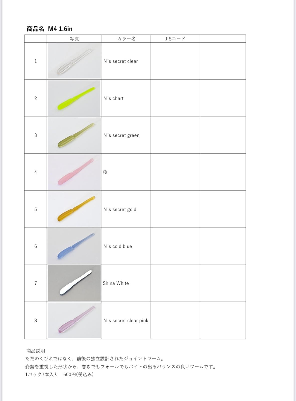 M4. 1.6 inは、そのコンパクトなサイズと効果的なアクションにより、小型フィッシュベイトやライトゲームを楽しむ方に最適なワームです!高い再現性を誇る動きで、ターゲットの魚をしっかりと引き寄せます。特にアジングやメバリングにおいて、その存在感を発揮し、釣行をさらに充実させるアイテムとなっています。ストップ&ゴーでも柔らかい動きをしっかりと表現し、さまざまなシチュエーションに対応します。