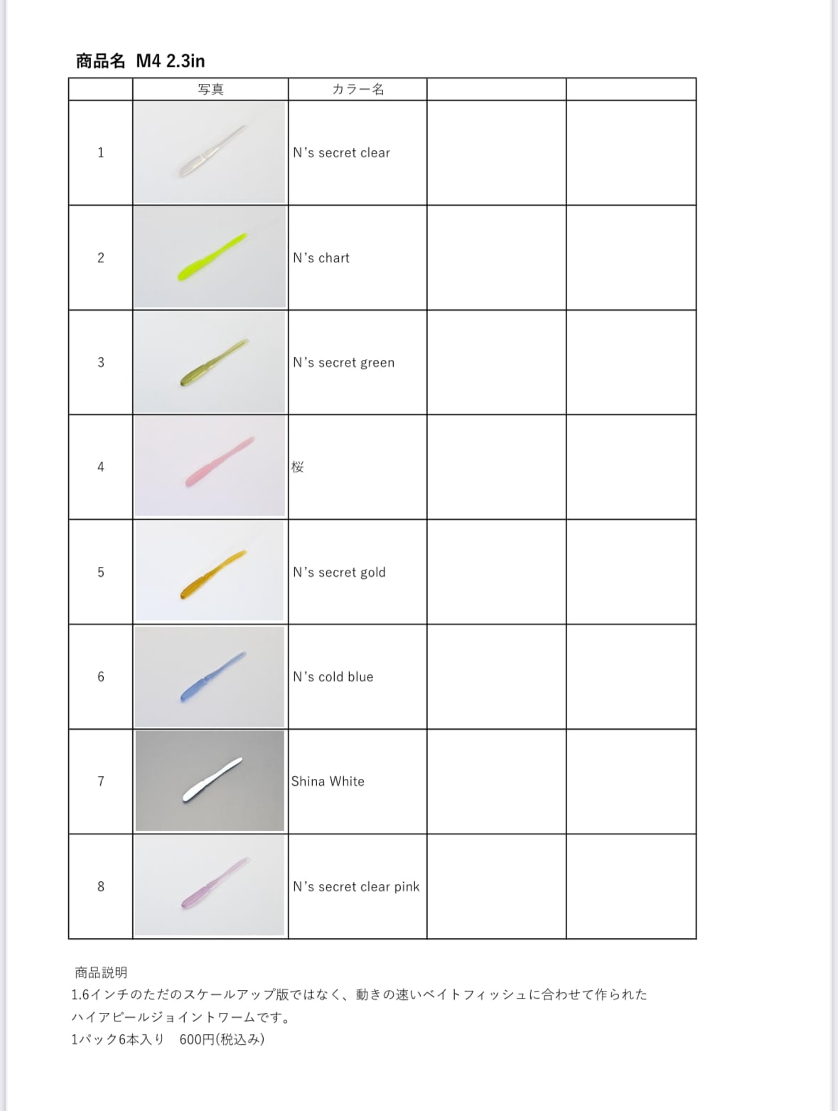 M4 2.3inのただのスケールアップ版ではなく、動きの速いベイトフィッシュに、合わせて作られたハイアピールジョイントワームです。