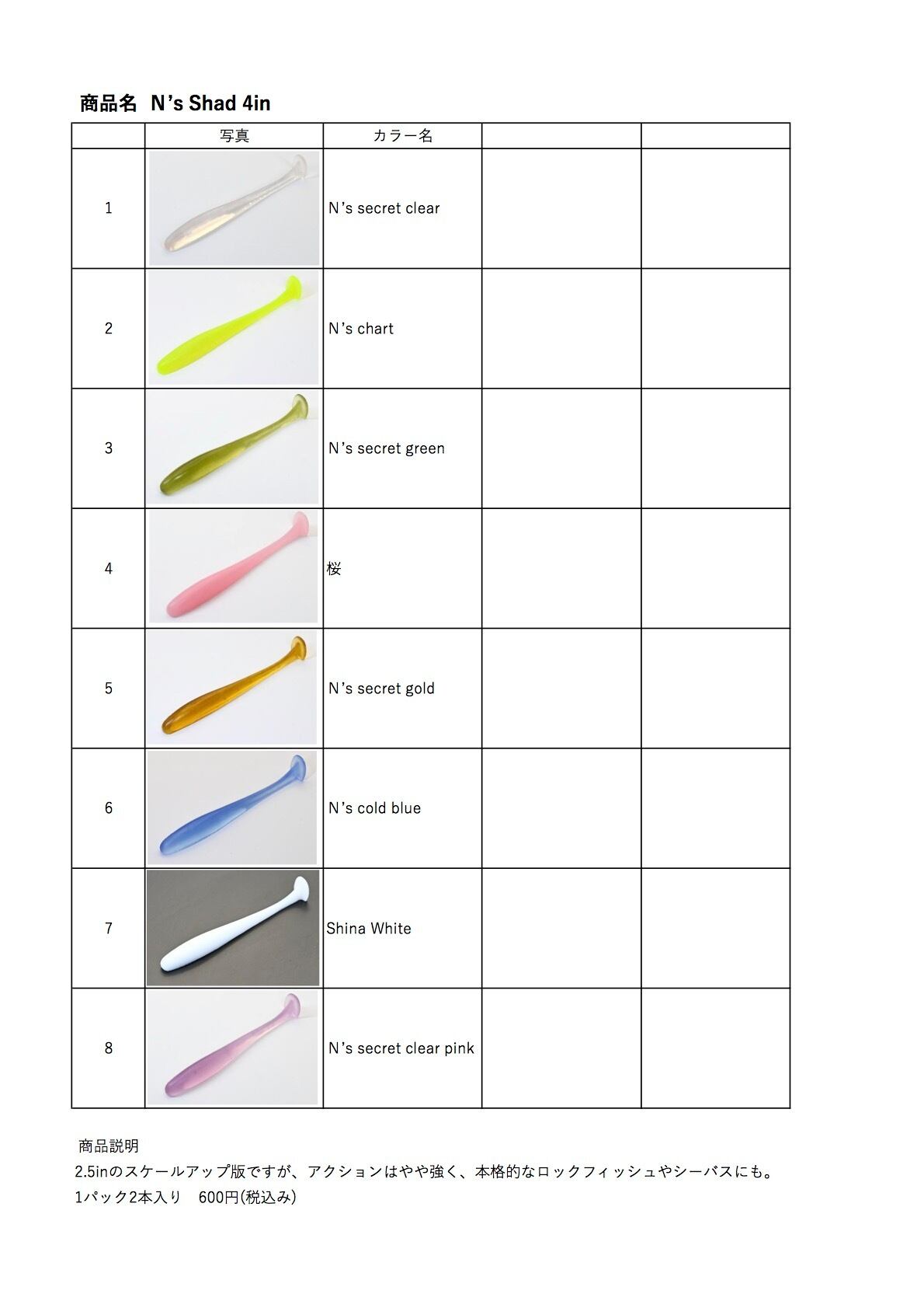 N's Shad 4inは、そのリアルなシェイプと動きでターゲットの魚をしっかりと引き寄せる特別なワームです。様々な釣りシーンで活躍し、高い効果を発揮し、釣行をより充実させるアイテムです。