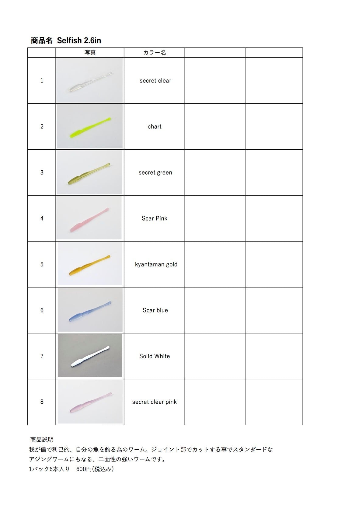 Selfishは、そのユニークなデザインと圧倒的なアクションで、幅広い釣りシーンで活躍します!特に、バスフィッシングやロックフィッシュ狙いに最適なワームで、巻きやフォール時に魚をしっかり引き寄せる存在感を誇ります。ストップ&ゴーの操作で誰でも簡単に扱えるため、初心者から上級者まで満足できるパフォーマンスを提供します。